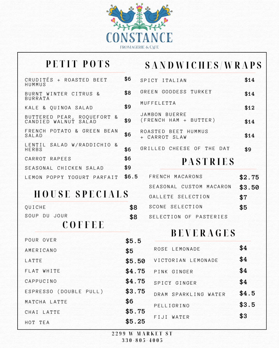 Our café menu highlights a seasonal selection of signature petite pots, gourmet sandwiches, housemade soups, and artisanal pastries.